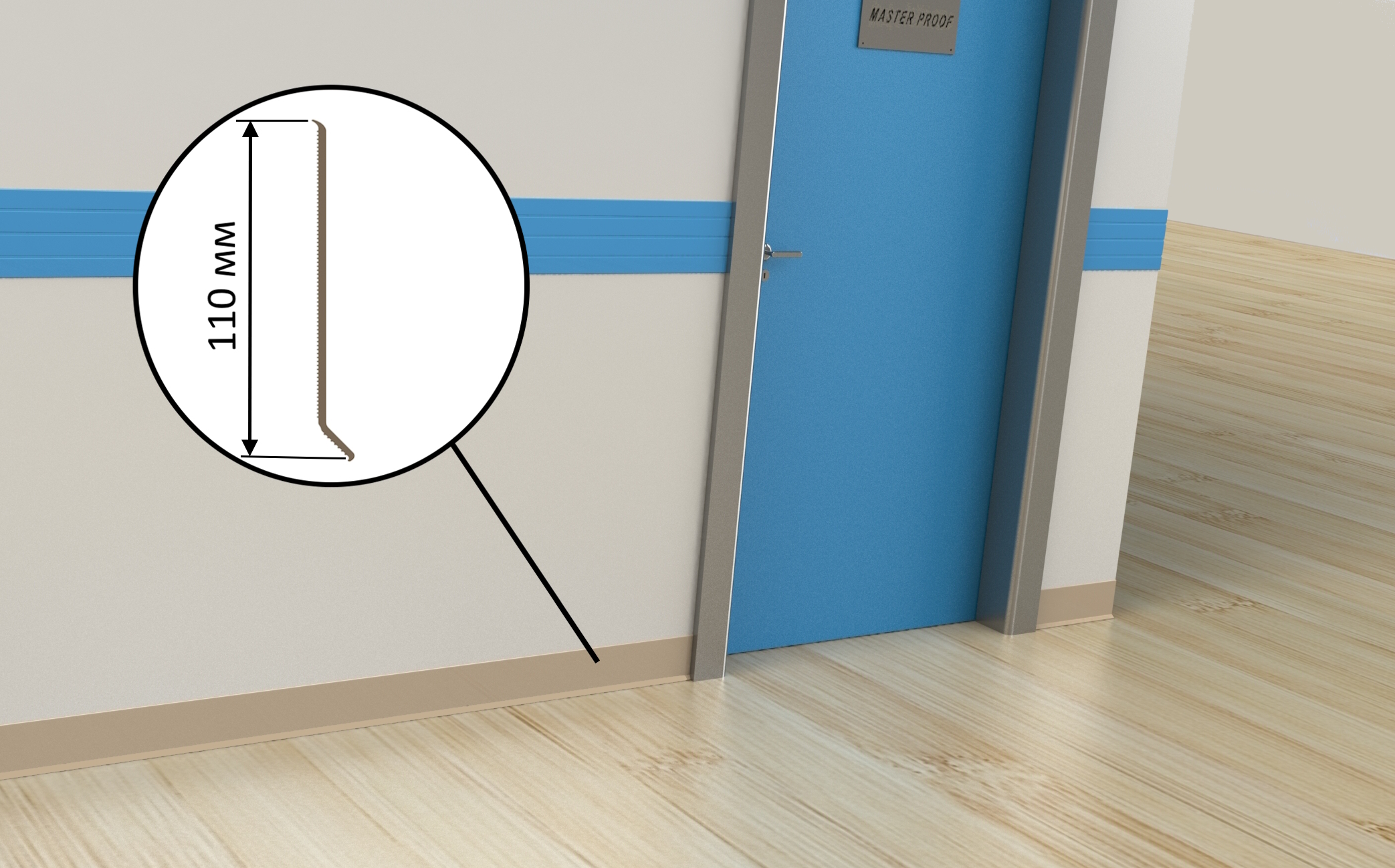 Видимый ПВХ плинтус MASTER PROOF легко монтируется при помощи клея. Это универсальный элемент, который помогает создать завершенный вид вашего интерьера. Возможно изготовление в любой цвет таблицы RAL. Предназначен для помещений с ламинатом, паркетом, линолеумом и ковровым покрытием.